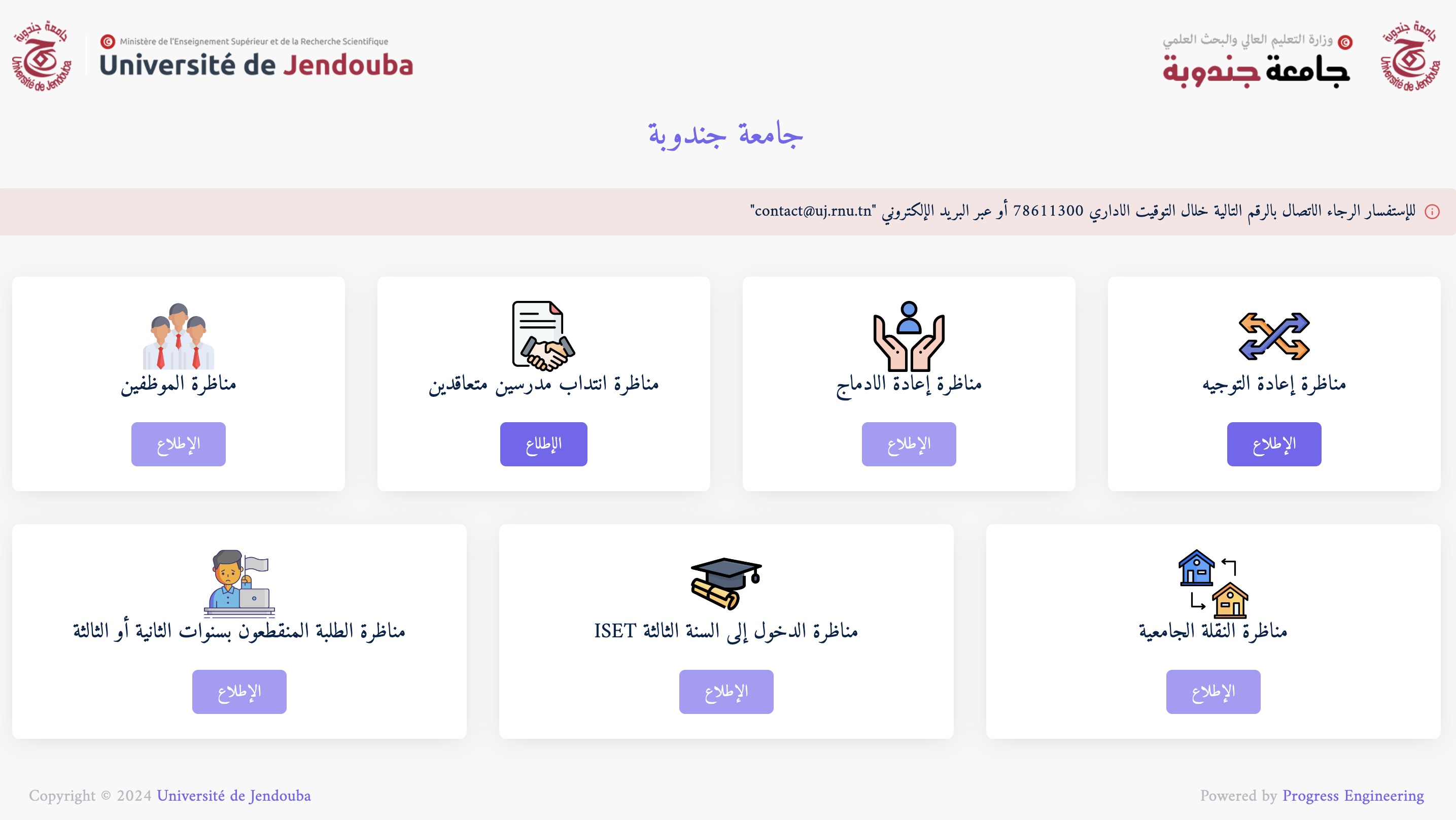Le projet consiste à développer une solution sur mesure pour la publication et la gestion des processus des concours à l’Université de Jendouba. Il s’agit d’une plateforme qui permet de créer, publier et gérer les concours de recrutement du personnel, de recrutement des enseignants contractuels ainsi cinq types de concours d’étudiants (concours de réorientation, d’intégration,…